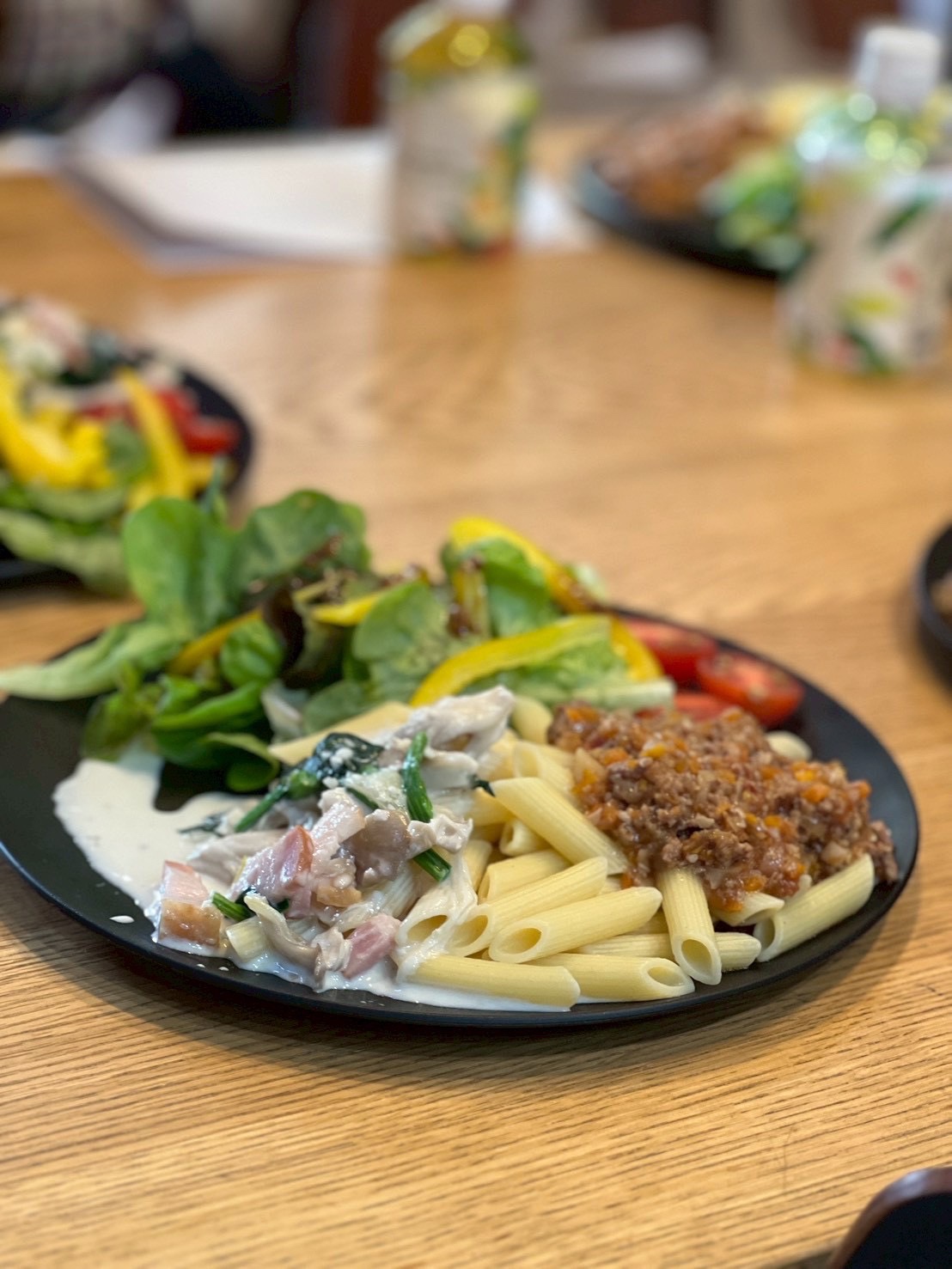 準備ができたらキッチンに移動し煮込んでいる間にクリームパスタとサラダを作っていきます。